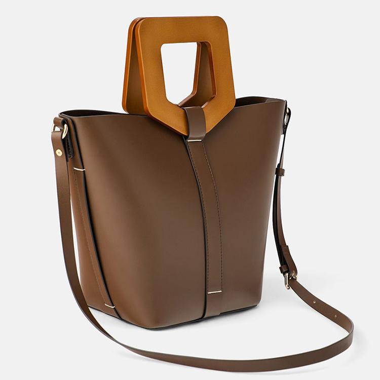custom smooth leather wooden handle ladies hand bag women bucket handbag