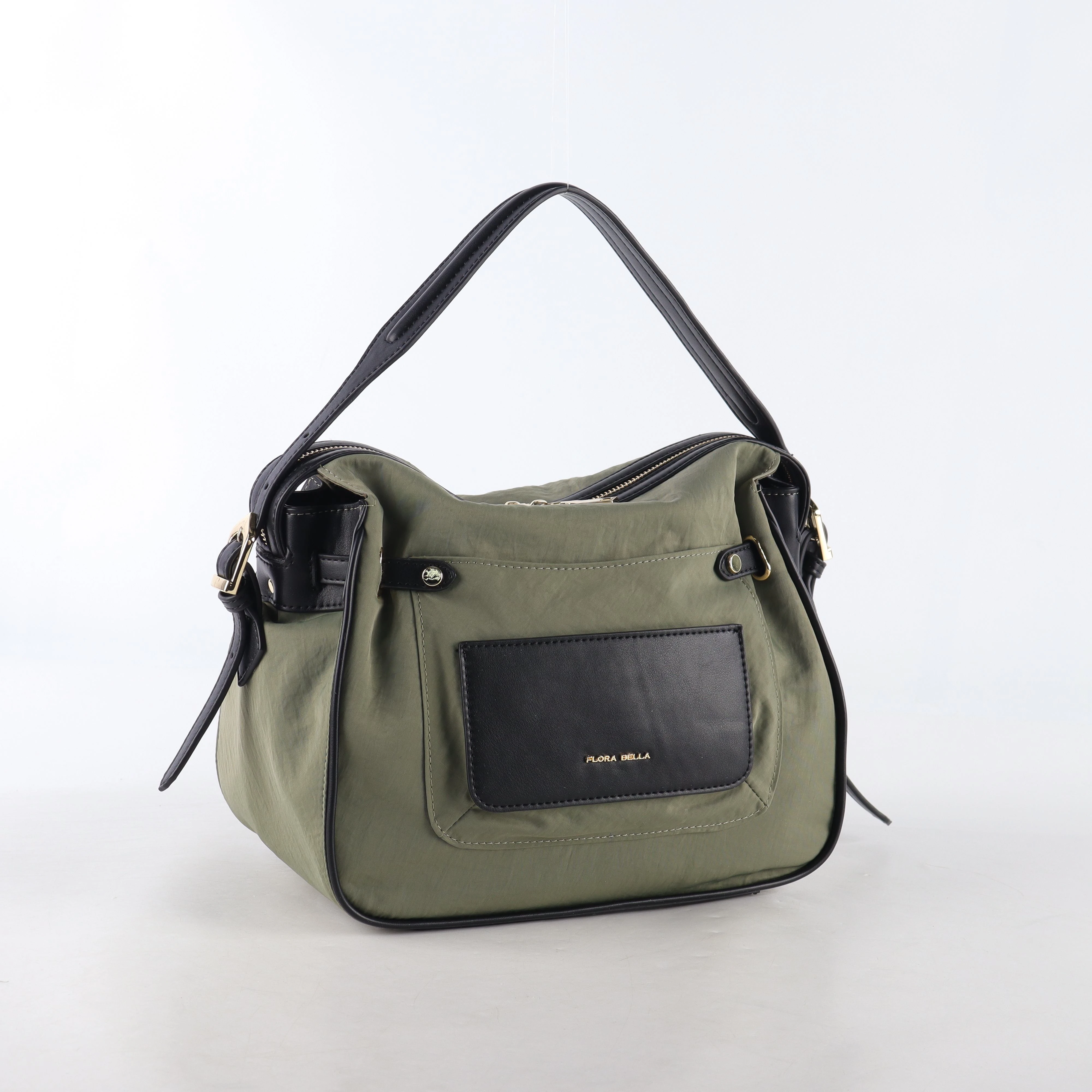 Elevate your everyday style with this versatile Flora Bella hobo bag, designed for the modern, on-the-go lifestyle. Crafted from durable, water-resistant olive green nylon and accented with sleek black faux leather trim, this bag seamlessly blends functionality with a casual-chic aesthetic.
