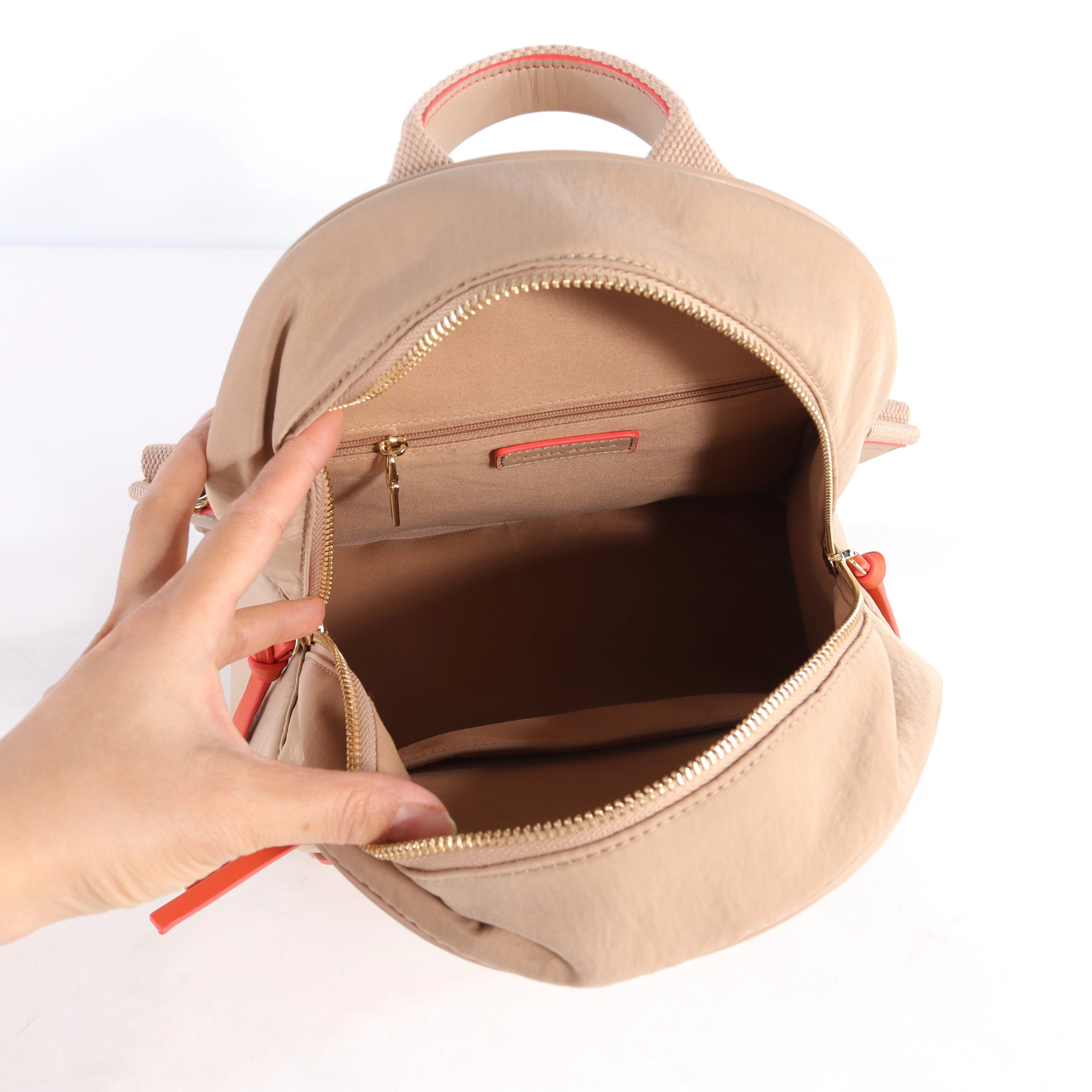 Questa borsa è stata progettata per le donne moderne che apprezzano sia lo stile che la funzionalità. Grazie alla sua struttura leggera, non vi appesantirà, mentre il resistente materiale in nylon le permette di affrontare le esigenze dell'uso quotidiano. Le linee pulite e il tocco di corallo la rendono l'accessorio perfetto per elevare qualsiasi outfit, sia che siate dirette in ufficio sia che stiate esplorando una nuova città.