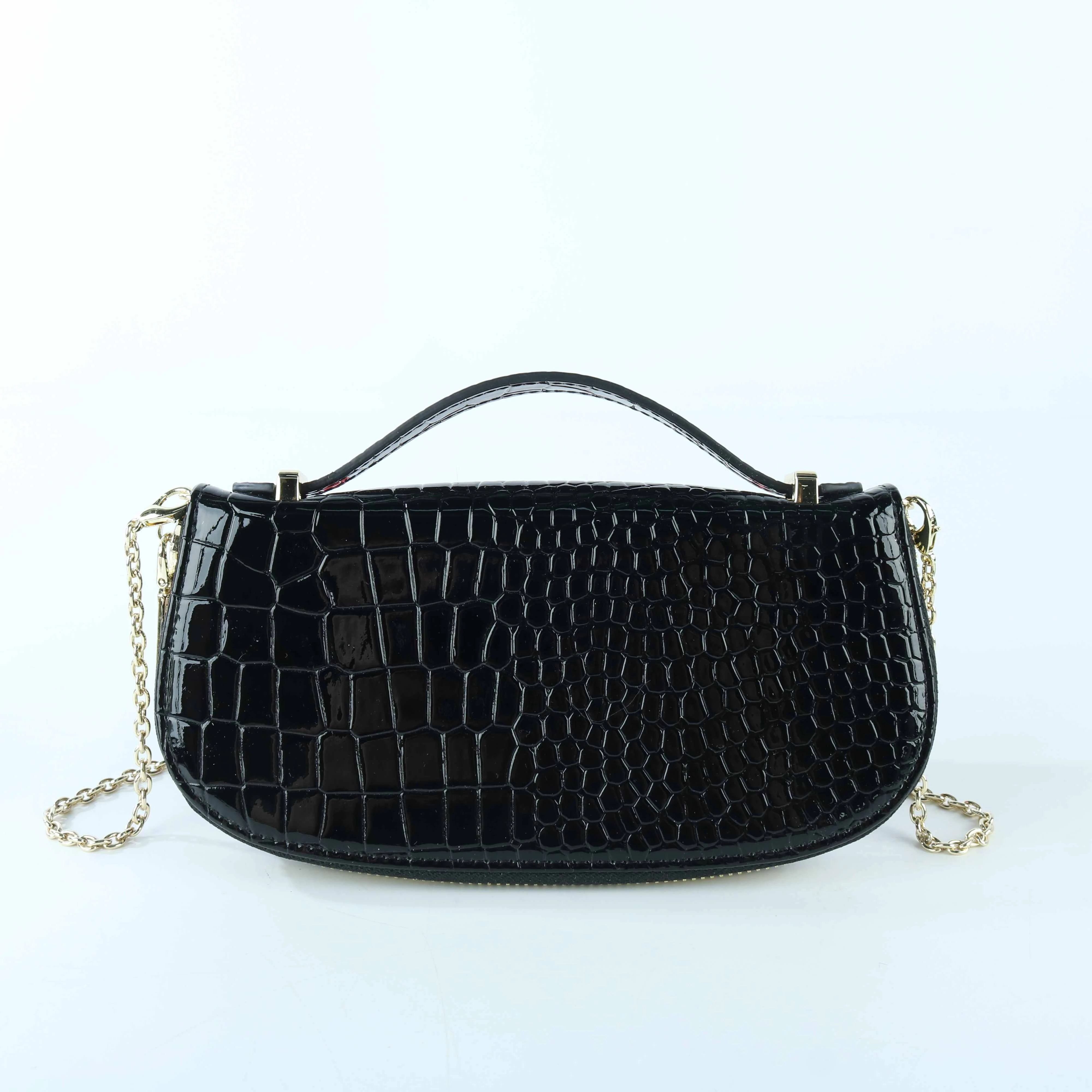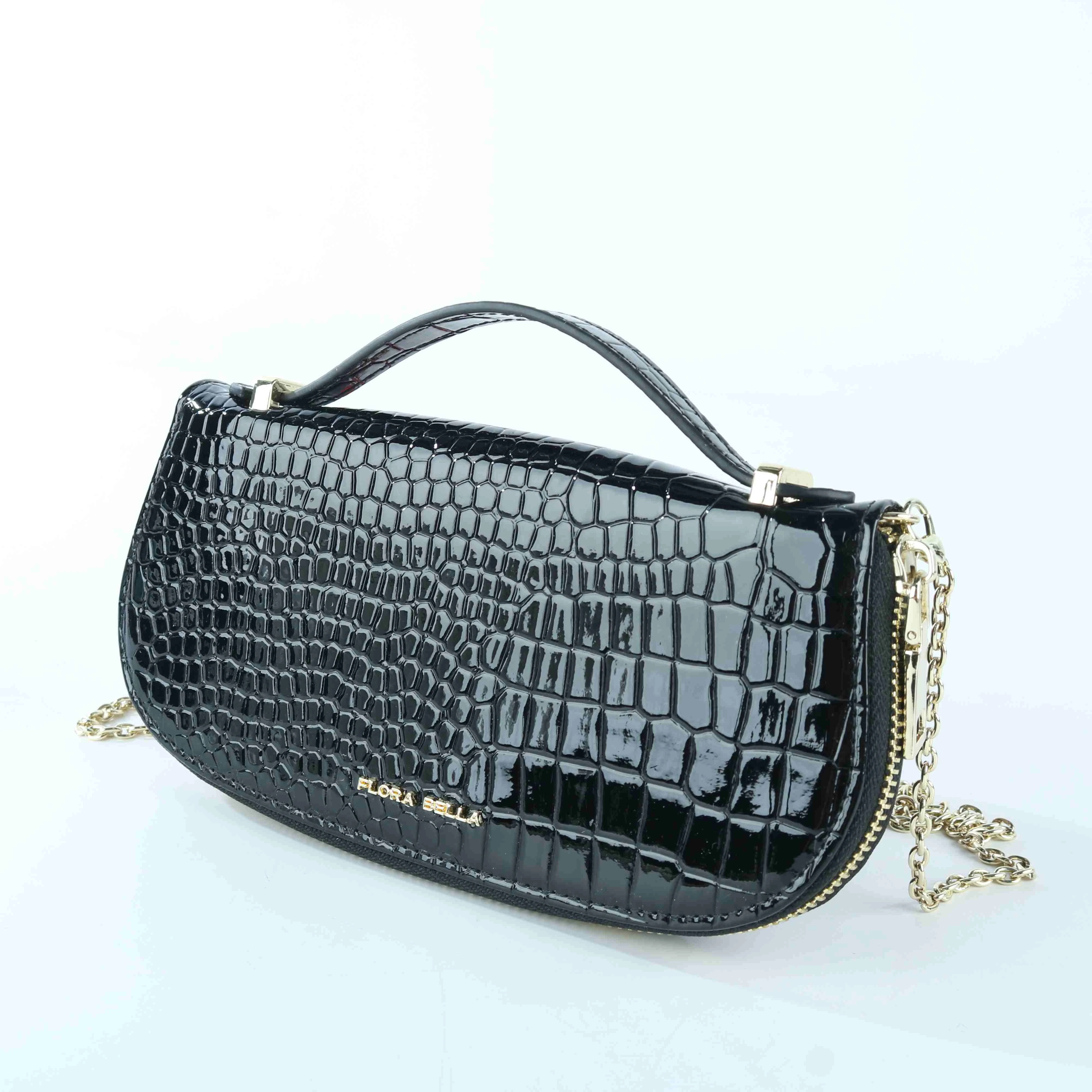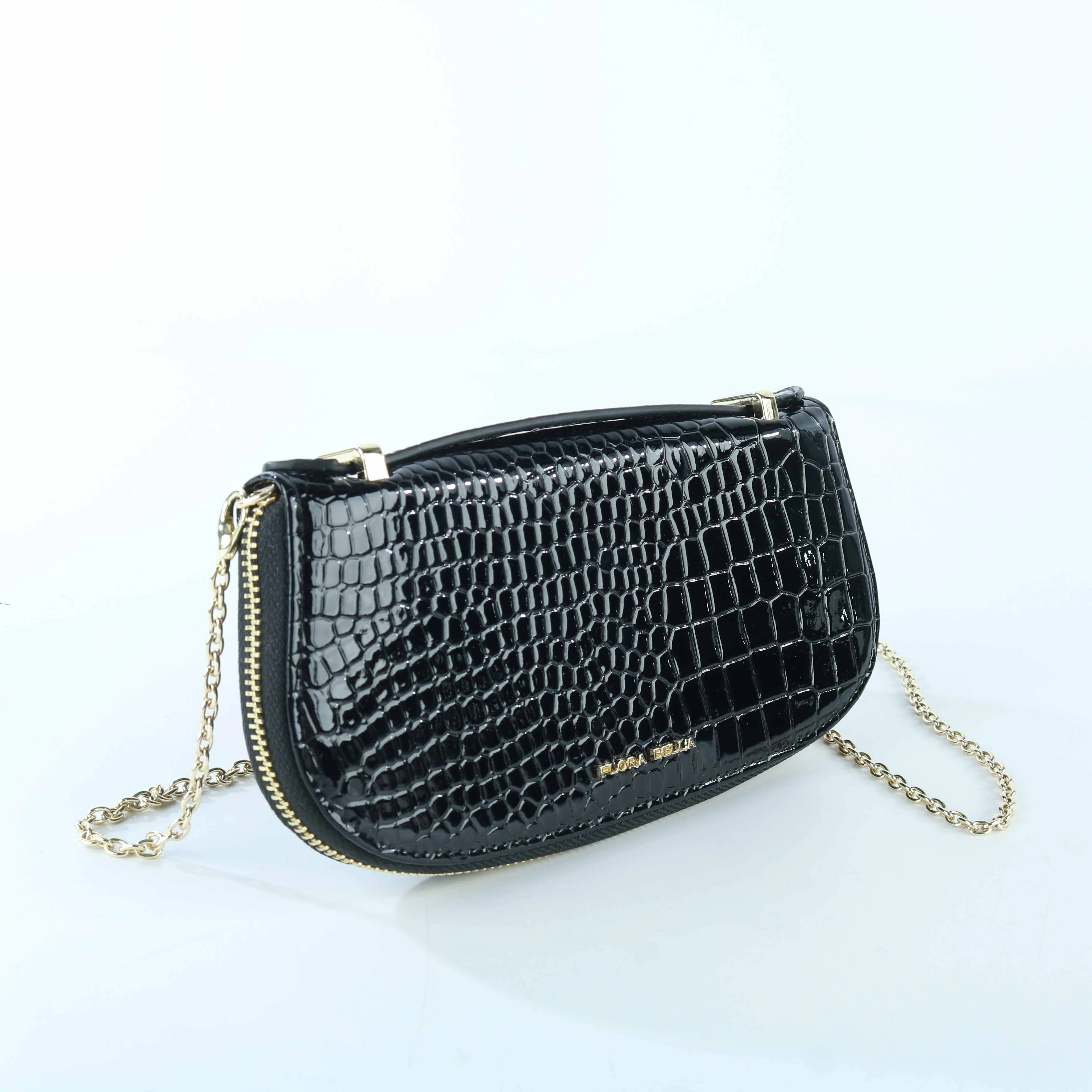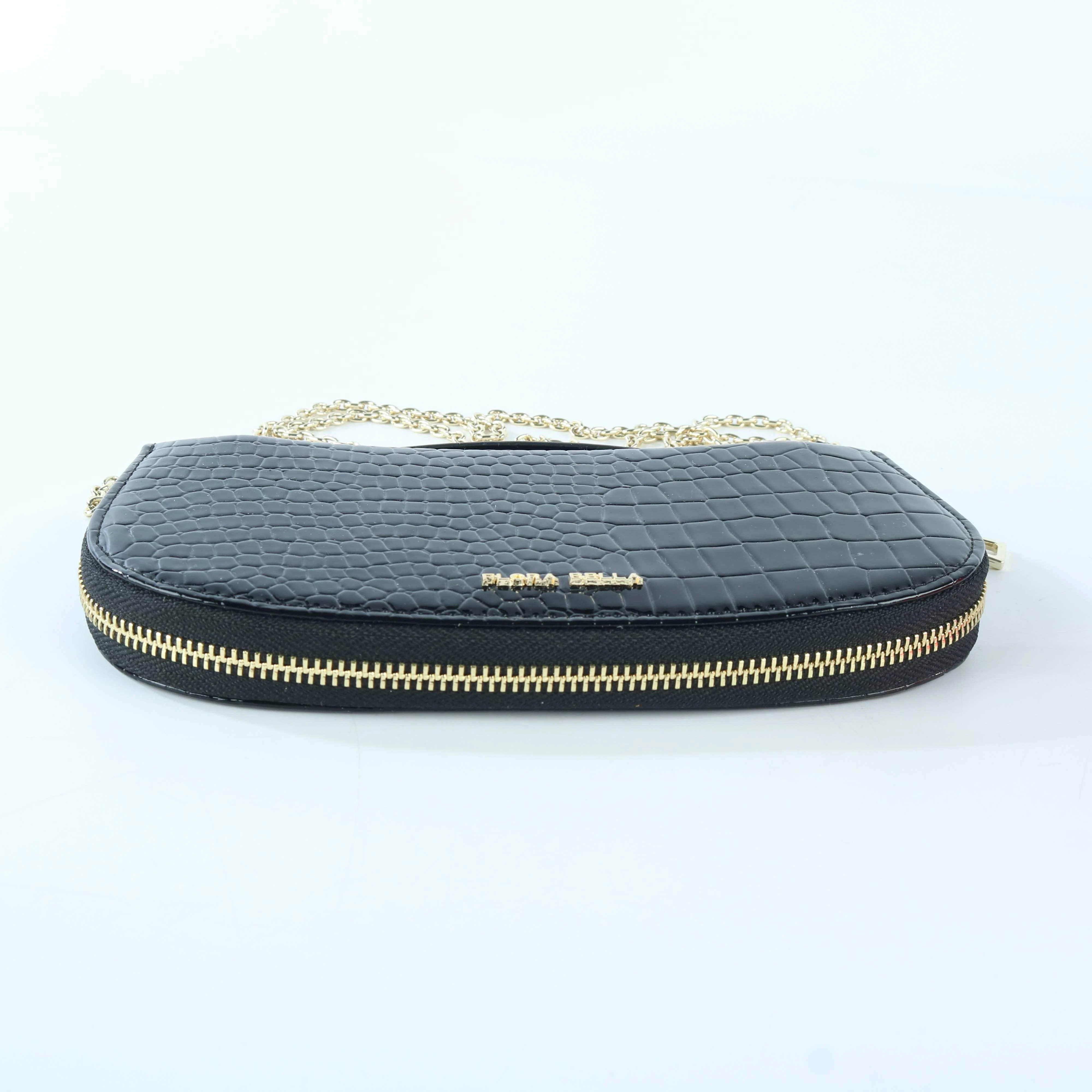 FLORA BELLA Crocodile Embossed Leather Clutch Bag – Black with Gold Chain