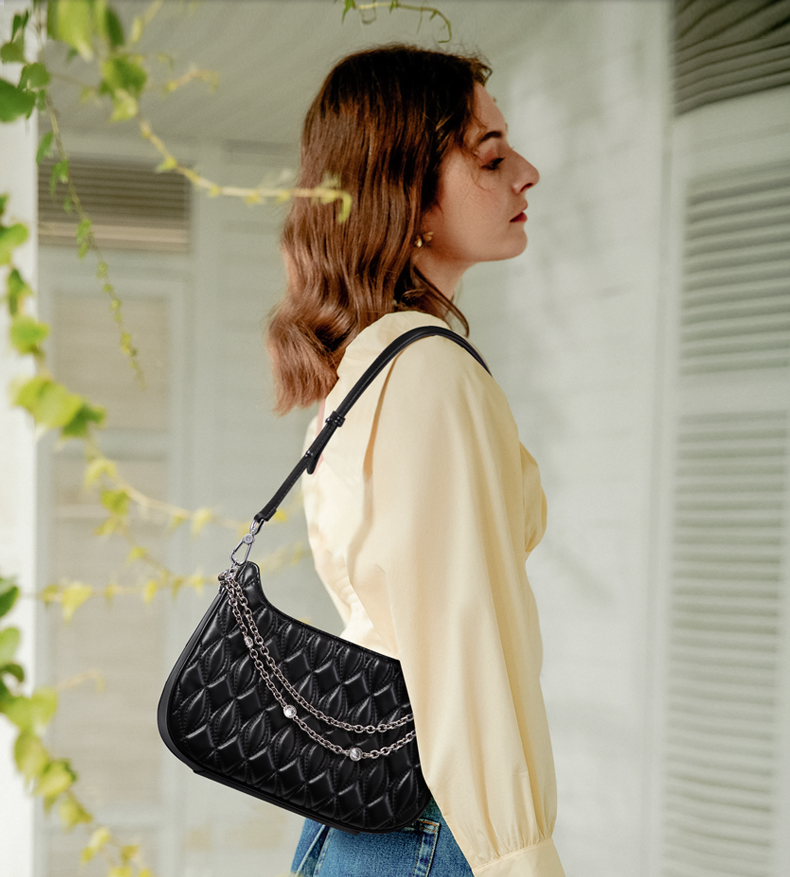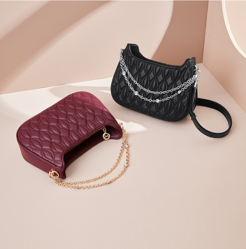 Chain as short handle, and adjustable PU shoulder strap, which is multifunctional.